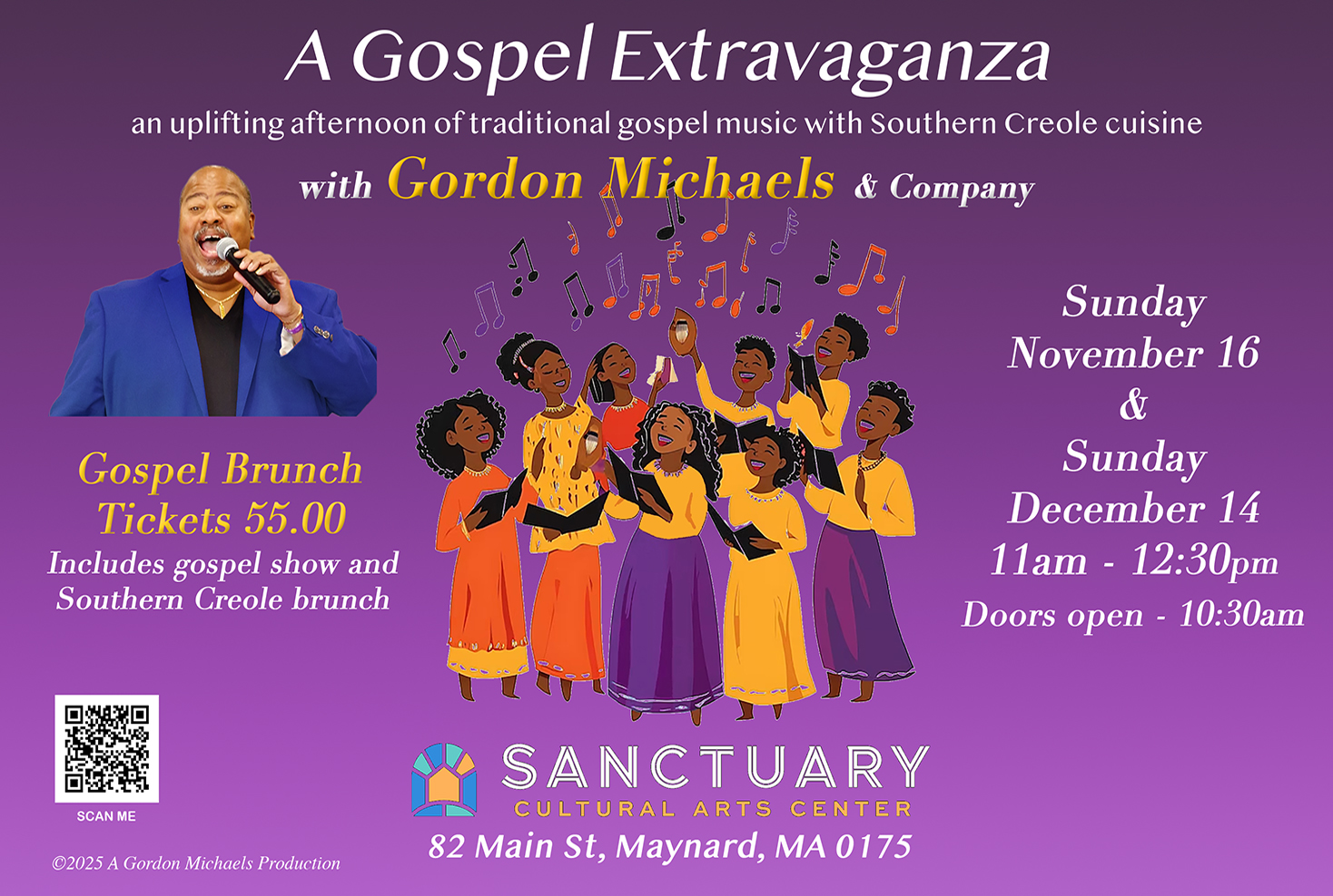 Get ready to be blessed! Gordon Michaels is back with a brand-new show that embodies the spirit of his original Gospel Brunch, which catapulted him to fame in Massachusetts. This limited-run Gospel Brunch Extravaganza in Maynard, MA, at The Sanctuary Cultural Arts Center, promises to be an unforgettable experience. Join us on November 16th and December 14th for a Cajun Creole Soul Food Brunch crafted by Gloria Moon Catering, accompanied by Gordon Michaels & Friends’ inspiring musical performance. Their soul-stirring melodies will have you singing along, tapping your feet, and reflecting on life. This extraordinary event brings together the best of old-time spirituals and contemporary gospel music. After a long hiatus, Gordon Michaels returns to the New England area, offering a unique opportunity to experience his Gospel Brunch magic. Don’t miss out on this incredible value – a brunch and concert for just $55.